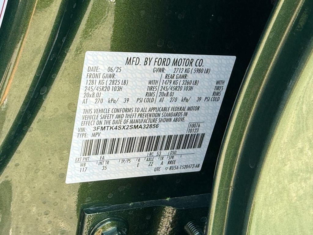 Bronze Appearance Package: Bronze Mesh Front Grille Shield; mach-E 4x Door Badges and Rear Gt Badge. Equipment Group 400A Standard Package: Single Speed Transmission; Heated Perforated ActiveX Performance Seats; Dual Motor EAWD (rear/upgraded Front); 20" Monochromatic High Gloss Black-Painted Wheels; 245/45R20 All-Season BSW Tires; B&O Sound System by Bang and Olufsen. Panoramic Fixed-Glass Roof. Eruption Green Metallic. Tire Inflator and Sealant Kit. **Equipment listed is based on original vehicle build and subject to change. Please confirm the accuracy of the included equipment by calling the dealer prior to purchase.**
